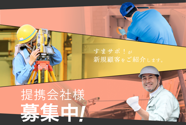 営業マンを増やす余裕がない・広告費を抑えたい・自社の得意分野の仕事を受注したいなど、すまサポがお客様と業者様を繋ぐお手伝いをいたします。